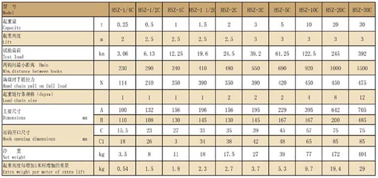 0.25t-1.5tHSZ-C型武林飛鴿手拉葫蘆性能參數表: